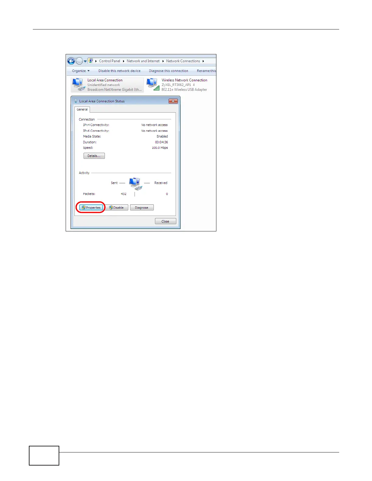 4 Double click Local Area Connection and then select Properties.