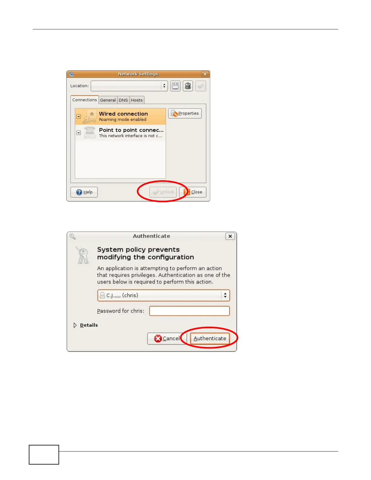 2 When the Network Settings window opens, click Unlock to open the Authenticate window. (By