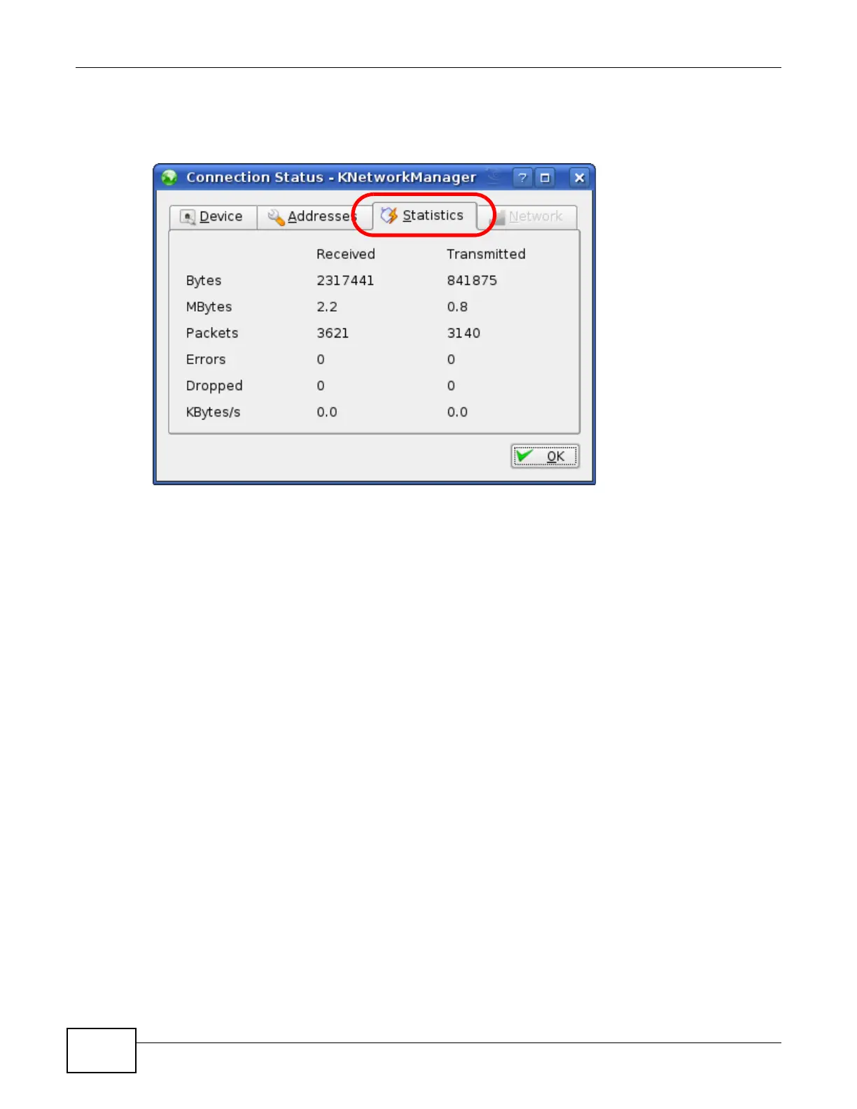 When the Connection Status - KNetwork Manager window opens, click the Statistics tab to
