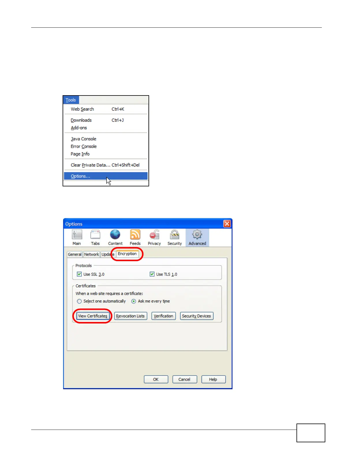2 In the Options dialog box, click Advanced > Encryption > View Certificates.