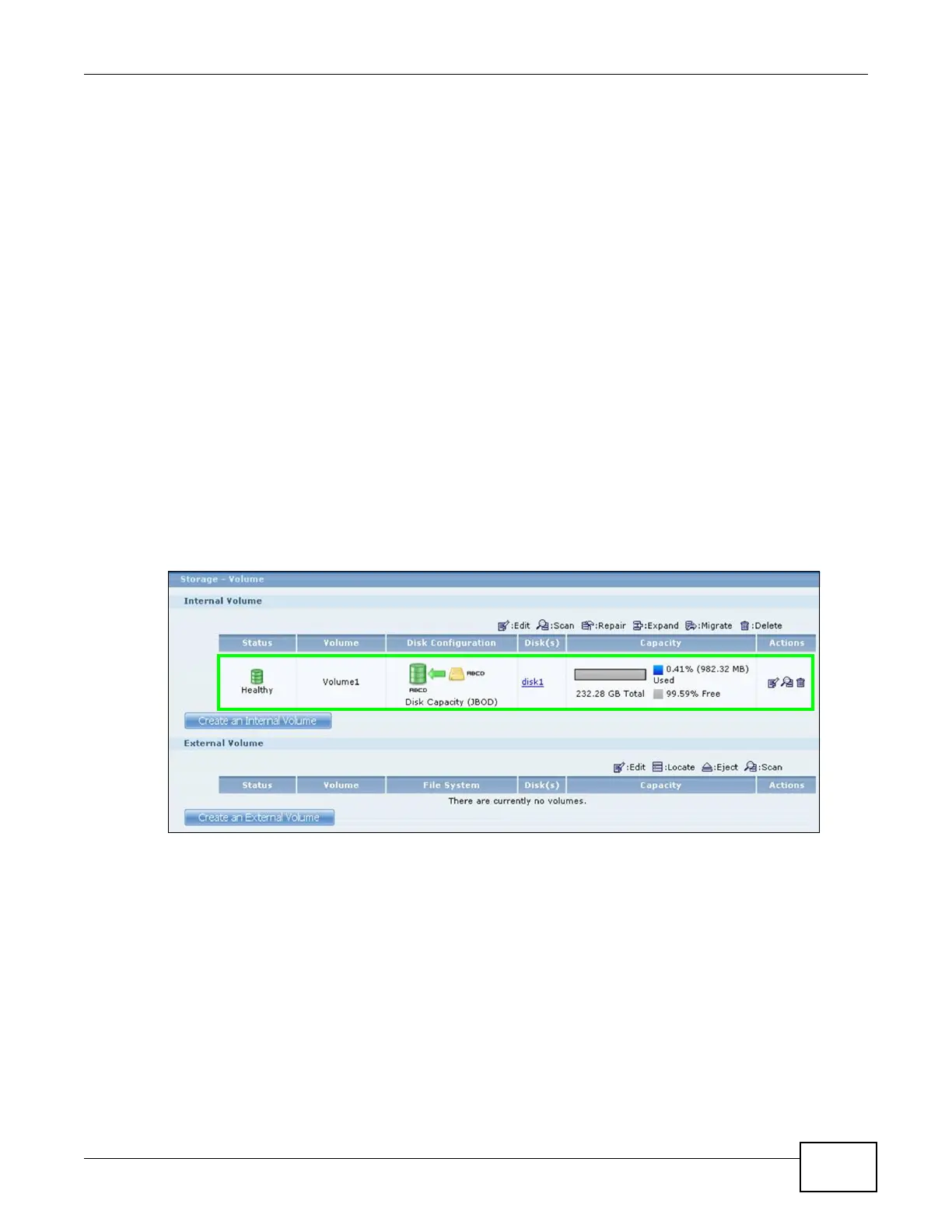 This JBOD volume shows up in the Storage > Volume screen (Section 8.3 on page 165) as