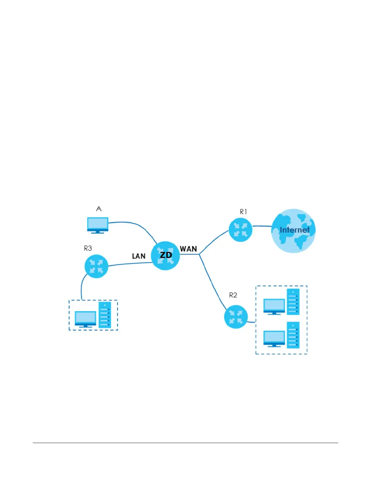 Zyxel Device routes most traffic from A to the Internet through the Zyxel Device’s default gateway (R1).
