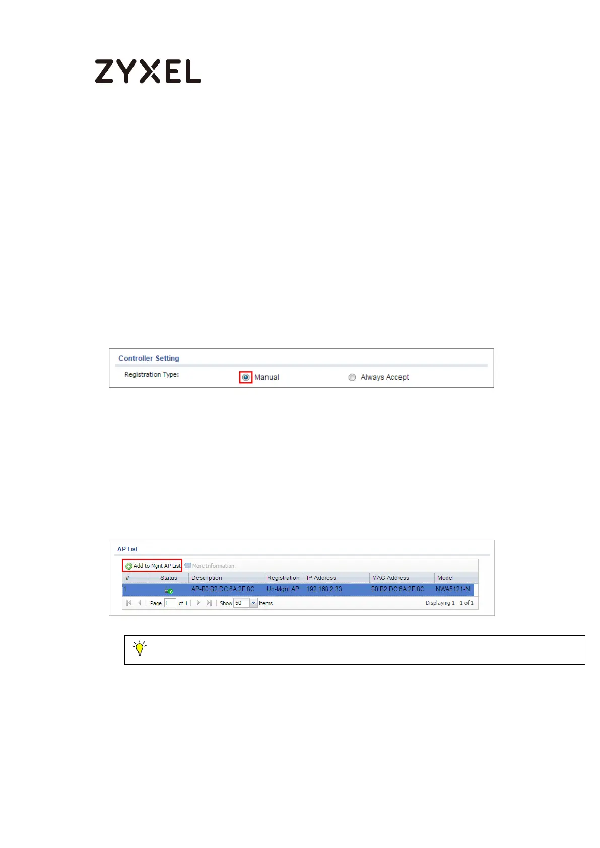 by the ZyWALL/USG. Select the listed AP and click Add to Mgnt AP List on the upper