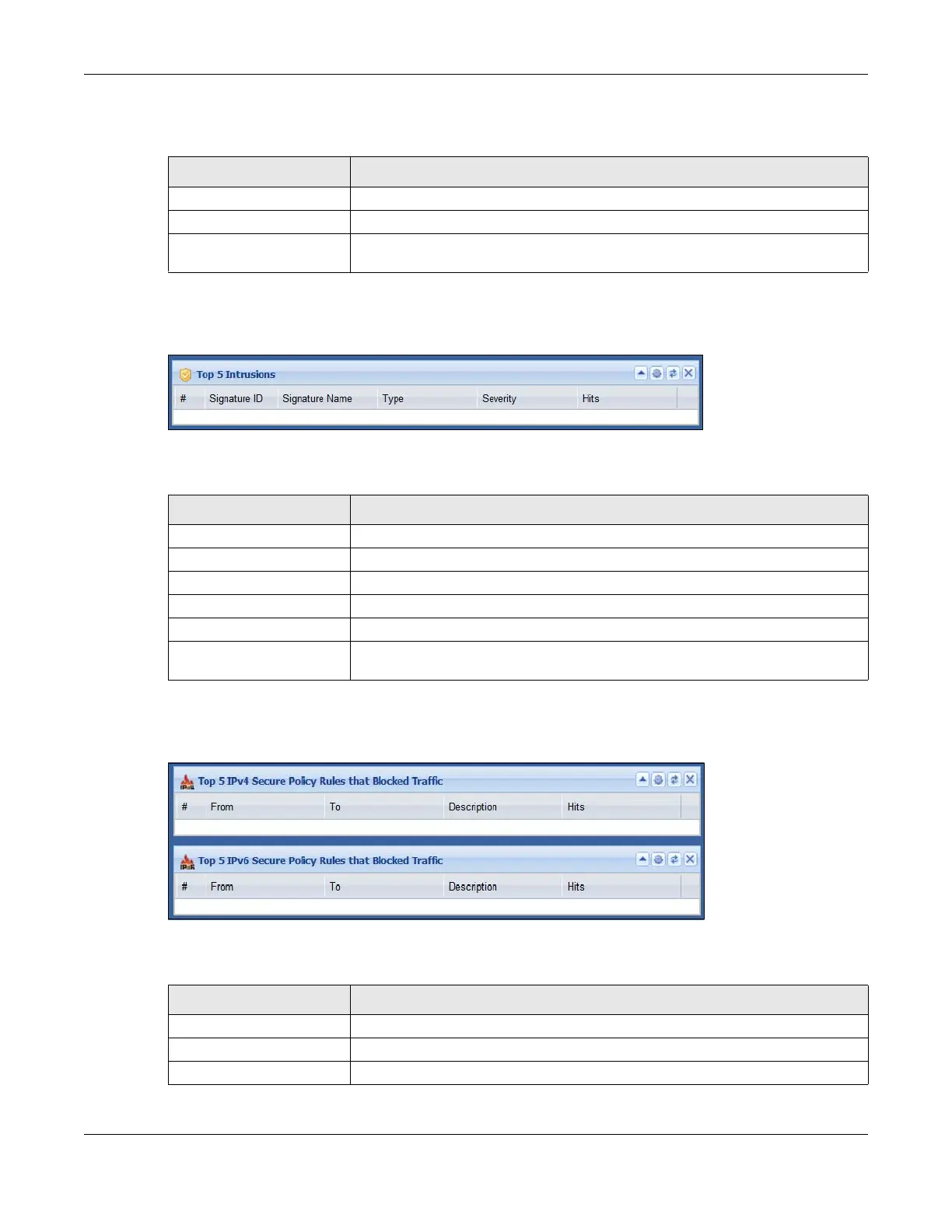 Table 34 Dashboard > Top 5 IPv4/IPv6 Security Policy Rules that Blocked Traffic