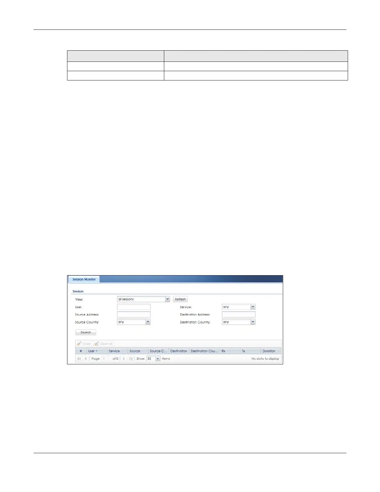 The Session Monitor screen displays all established sessions that pass through the Zyxel Device for