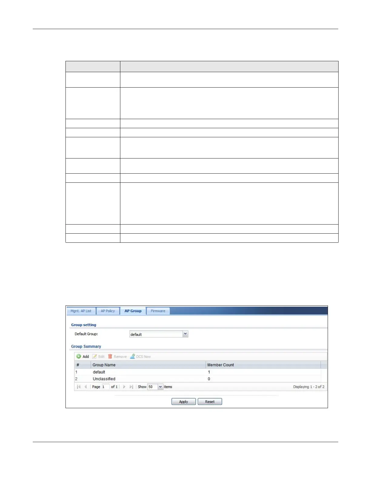 and apply the settings to all APs in the group. An AP can belong to one AP group at a time. Click