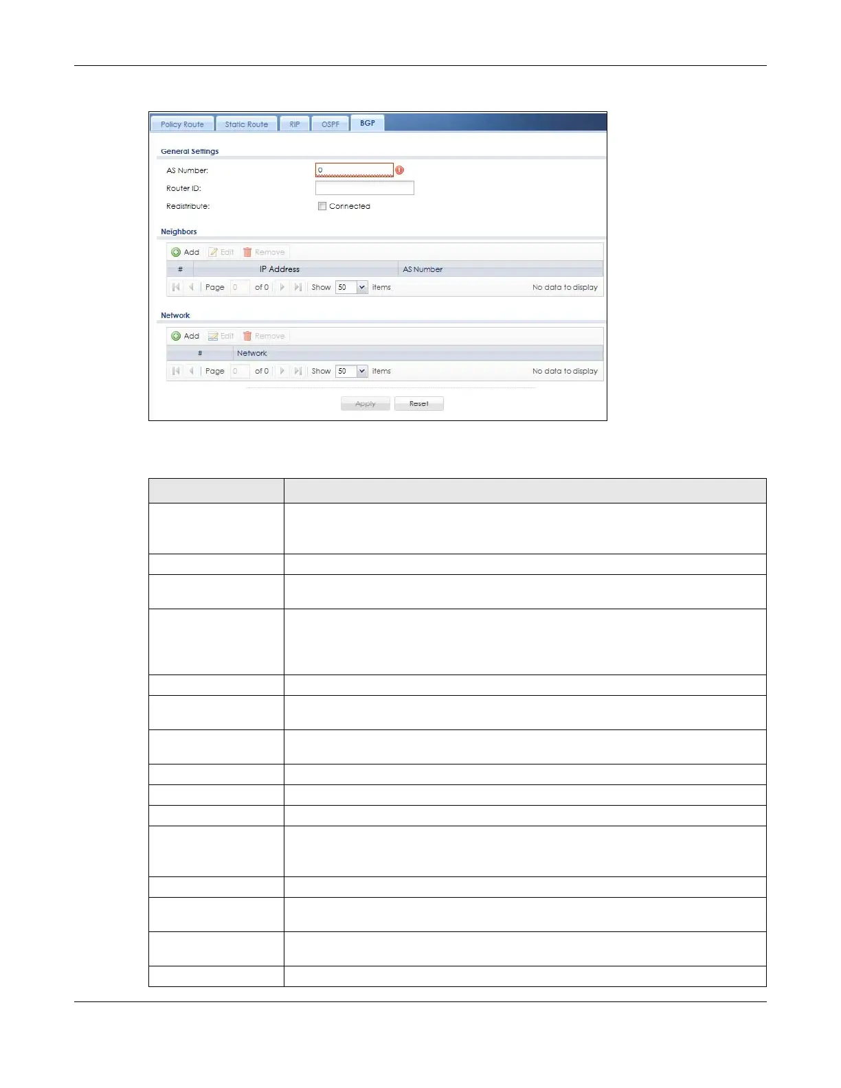 Note: The maximum number of neighboring BGP routers supported by the Zyxel