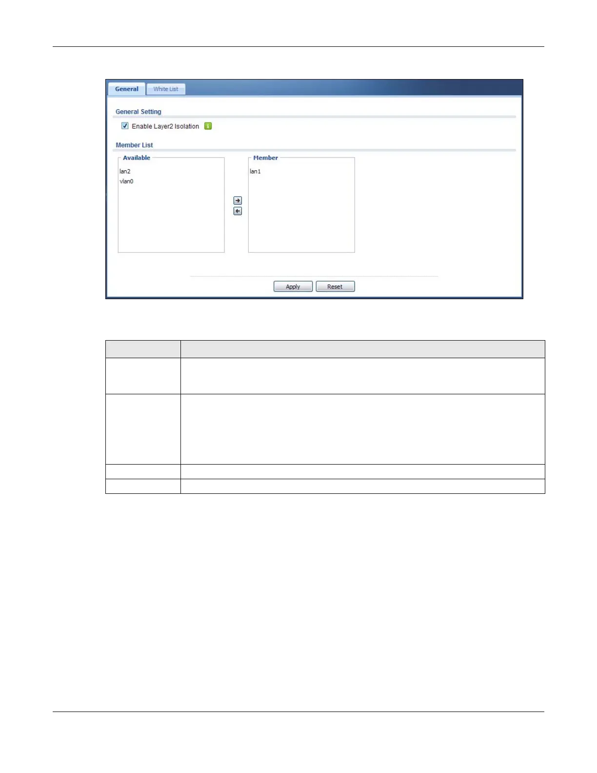 Table 164 Configuration > Network > Layer 2 Isolation
