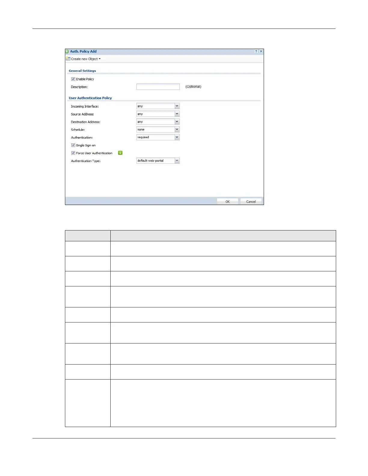 Table 171 Configuration > Web Authentication > General > Add Authentication Policy