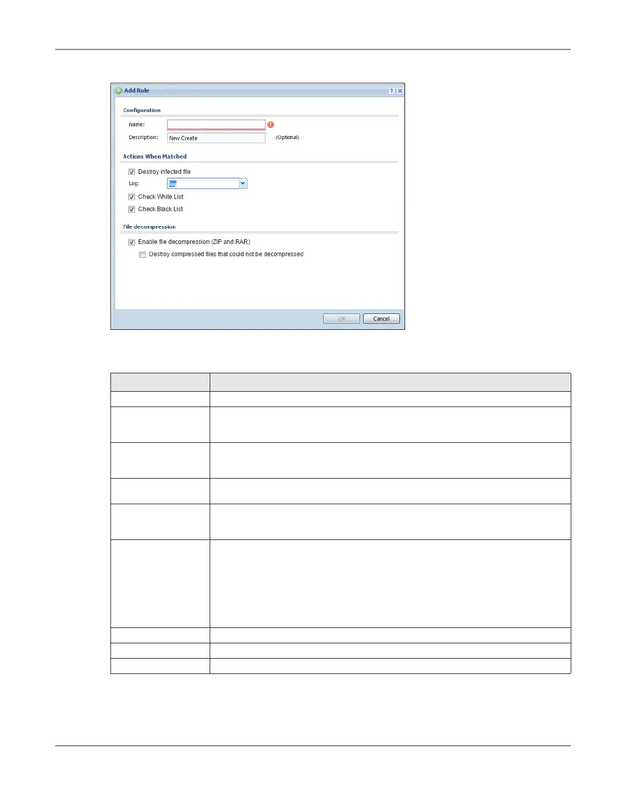 Description Enter a descriptive name for this anti-virus rule. You may use 1-31 alphanumeric