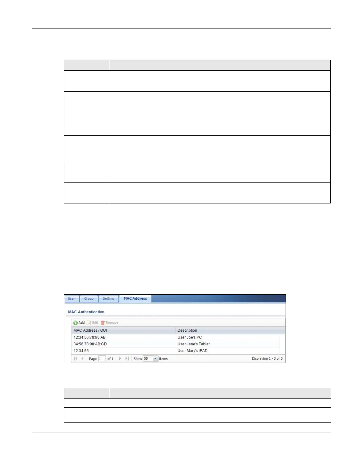 Table 301 Configuration > Object > User/Group > MAC Address