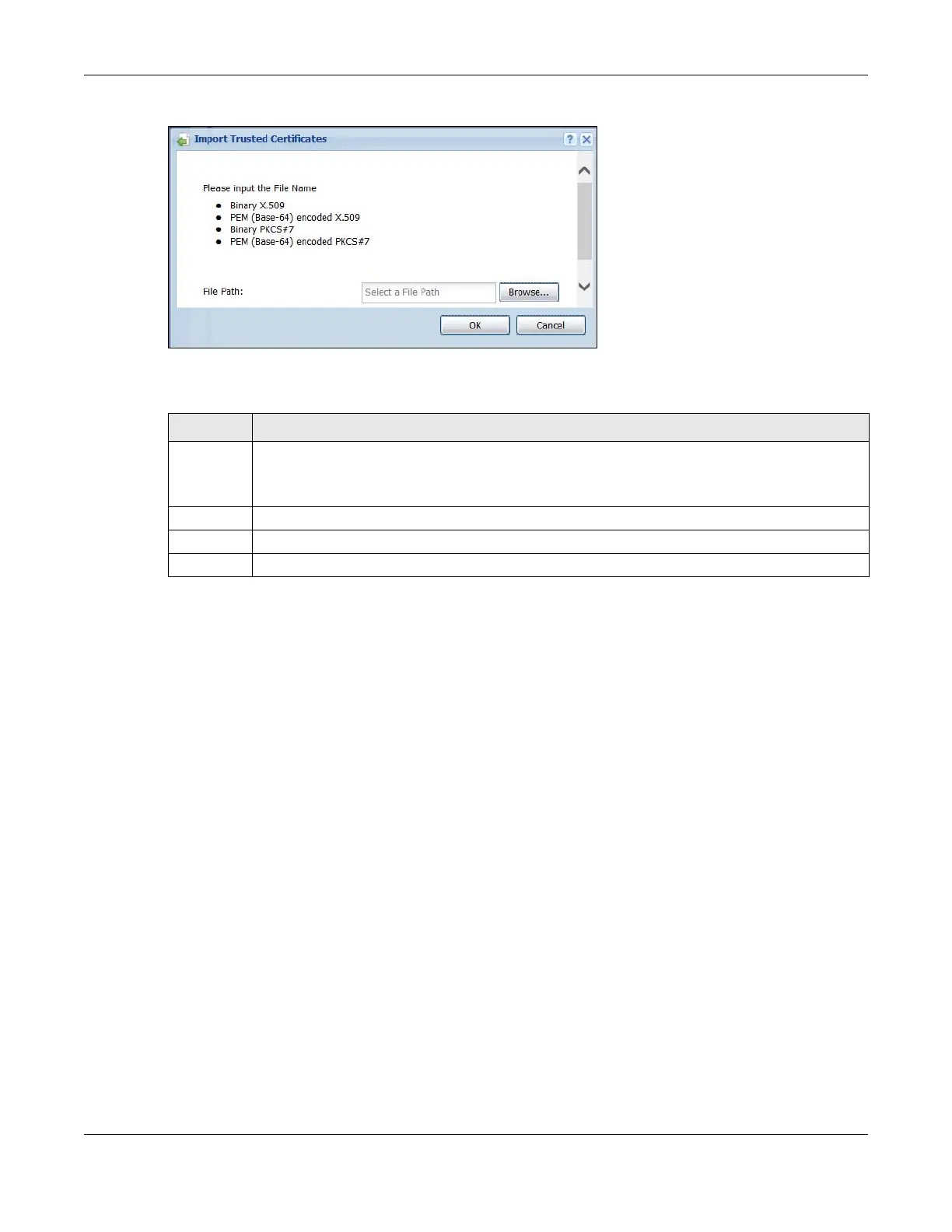 Table 353 Configuration > Object > Certificate > Trusted Certificates > Import