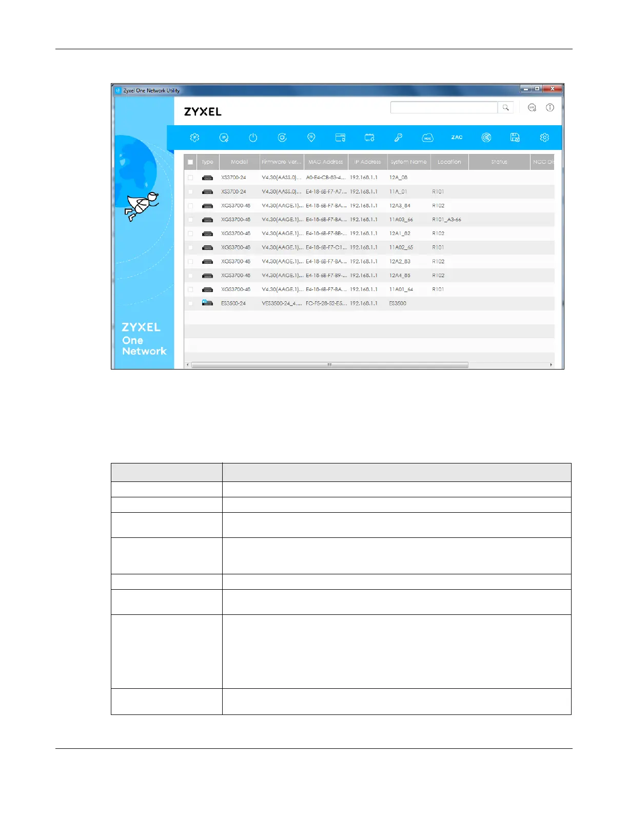 The following table describes the icons numbered from left to right in the ZON Utility screen.