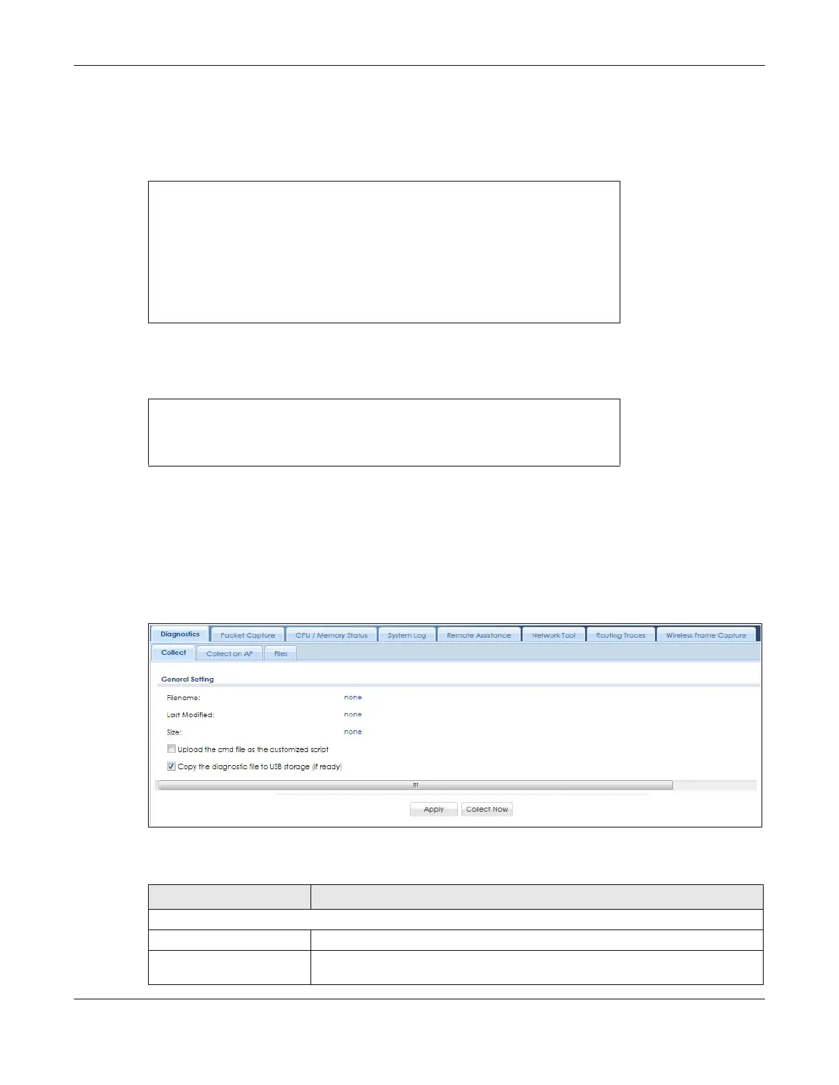 When you click Collect Now, a series of commands are run to display information about the Zyxel