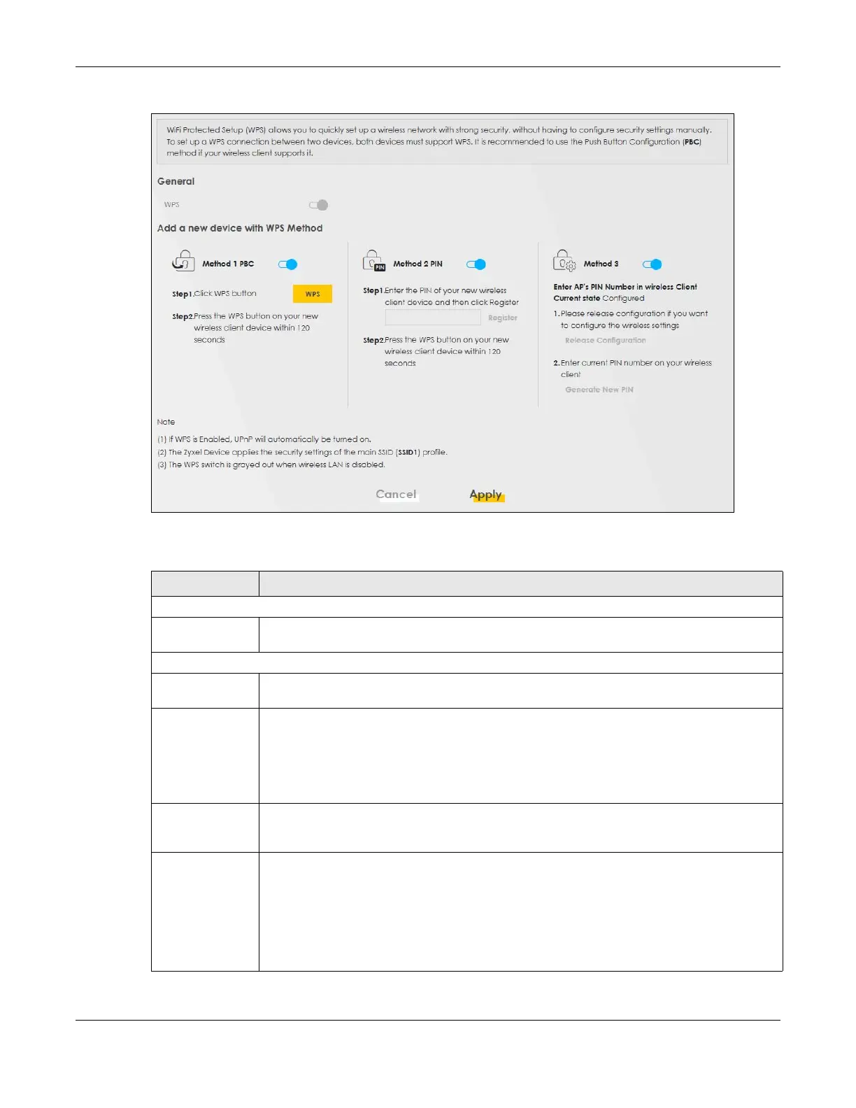 switch to make it turn blue. Click Apply to activate WPS method 1 on the Zyxel Device.