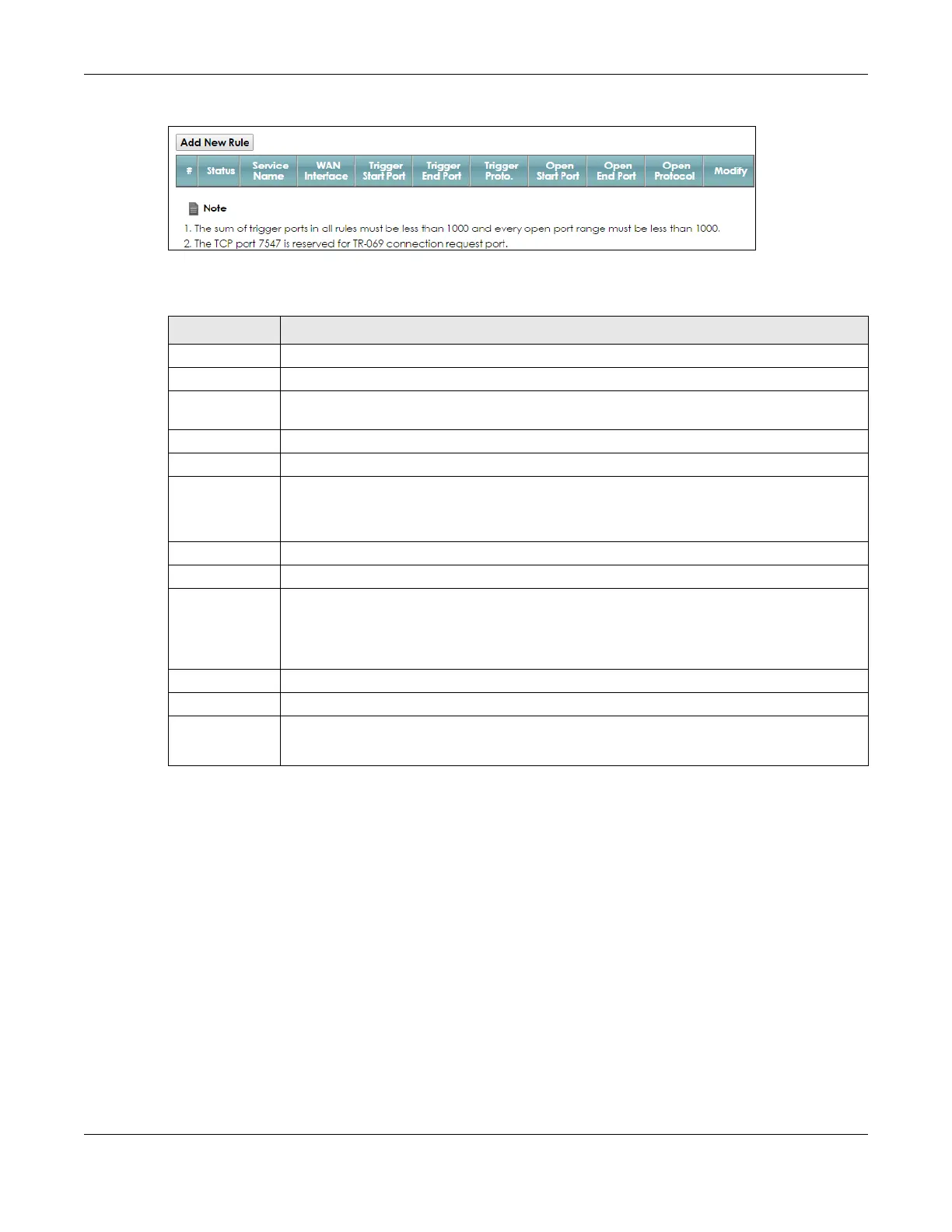 Trigger Start Port The trigger port is a port (or a range of ports) that causes (or triggers) the VMG to record the IP