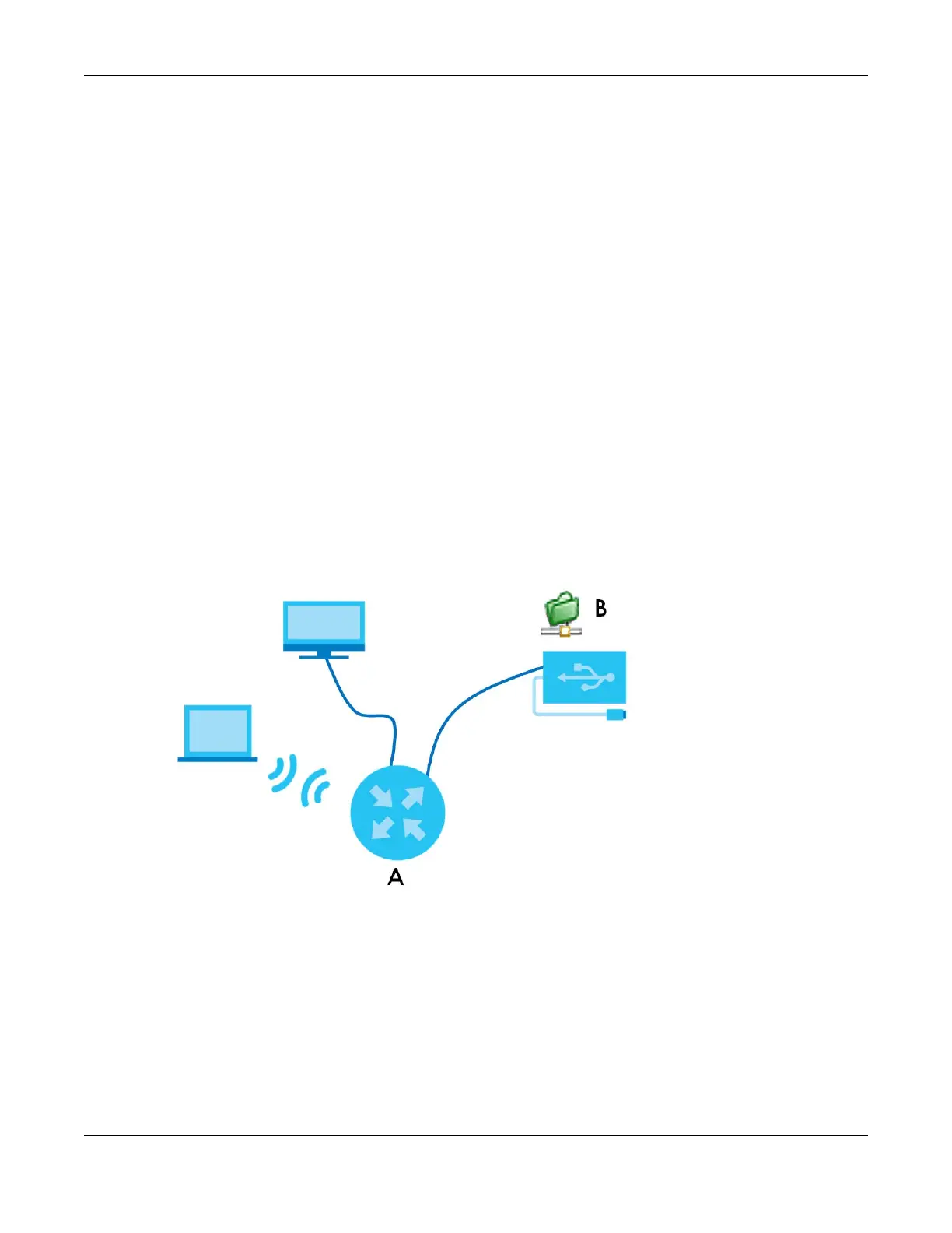 Use the built-in USB 2.0 port to share files on a USB memory stick or a USB hard drive (B). Use FTP to access