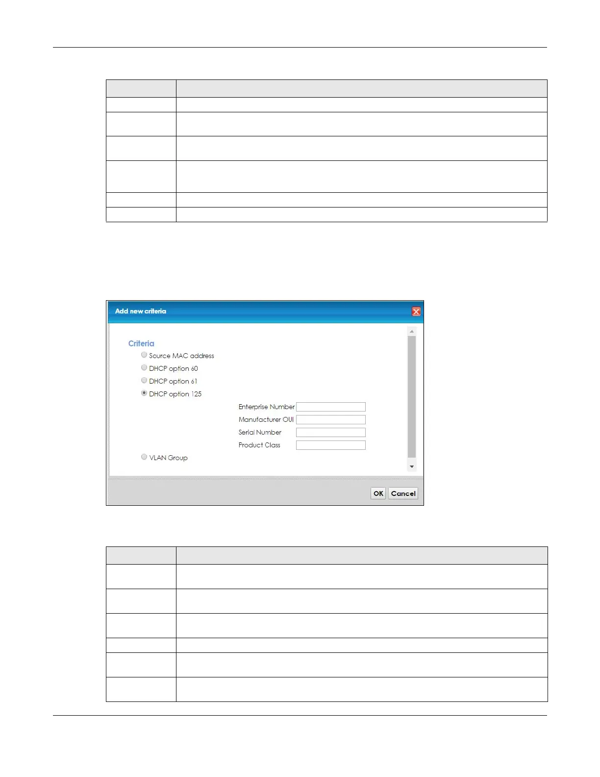 DHCP Option 60 Select this option and enter the Vendor Class Identifier (Option 60) of the matched traffic, such
