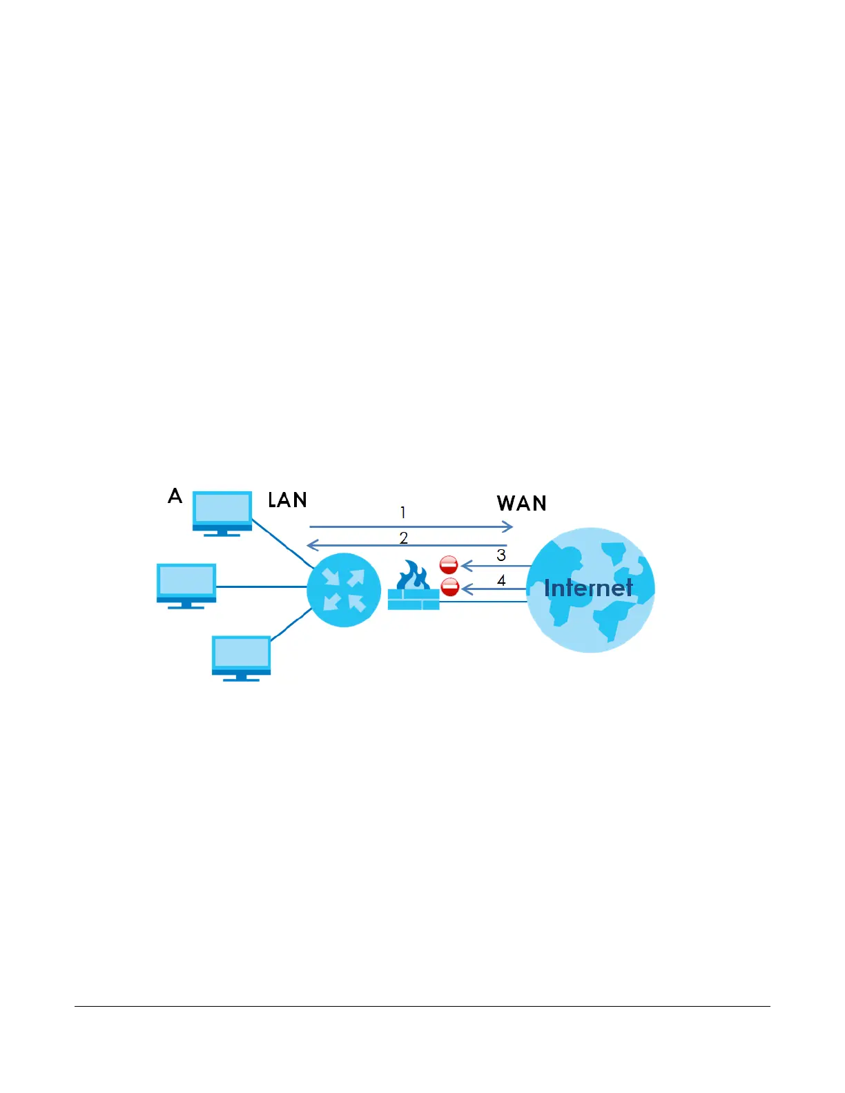 session from the LAN to the WAN (1). Return traffic for this session is also allowed (2). However other traffic