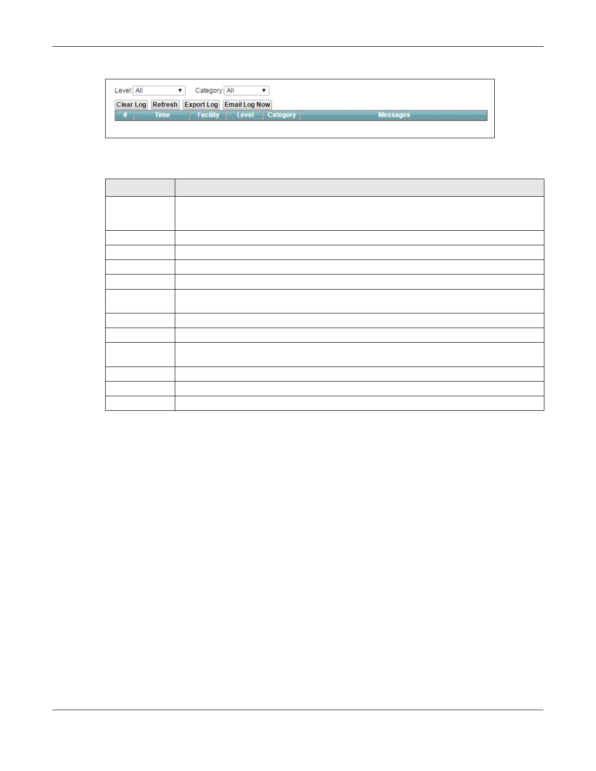 Level This field displays the severity level of the log that the device is to send to this syslog server.