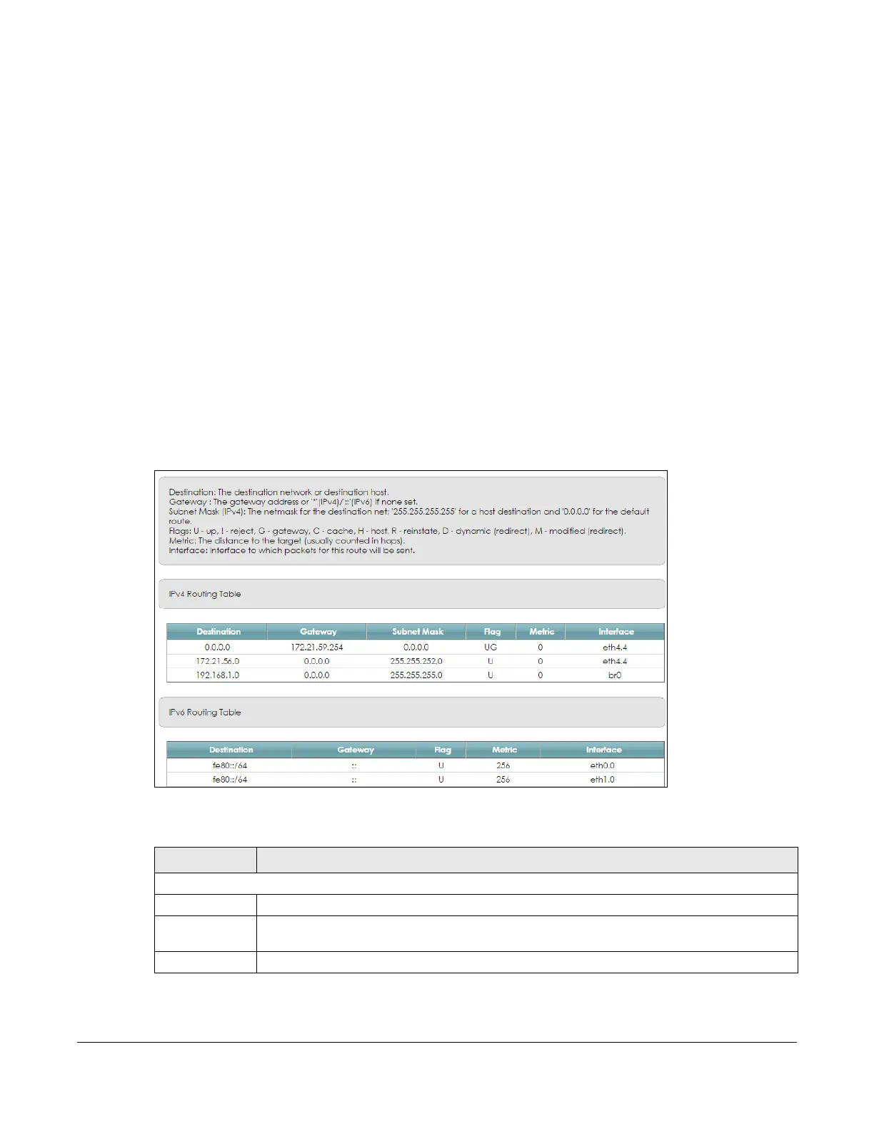 Gateway This indicates the IPv4 address or IPv6 address of the gateway that helps forward this route’s