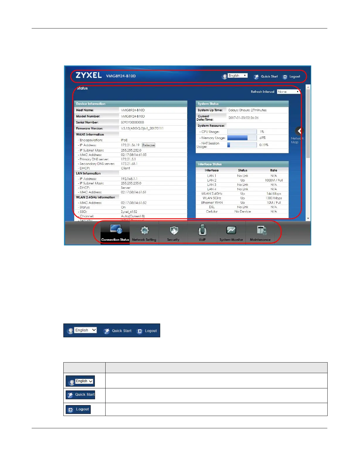 Quick Start: Click this icon to open screens where you can configure the VMG’s time zone