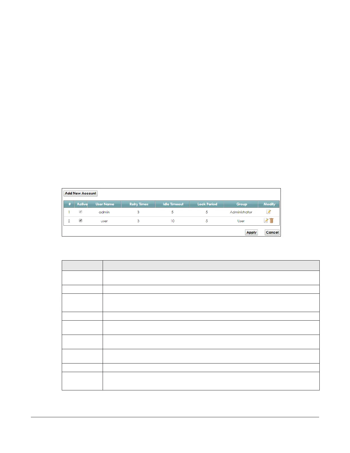 Idle Timeout This field displays the the length of inactive time before the VMG will automatically log the user