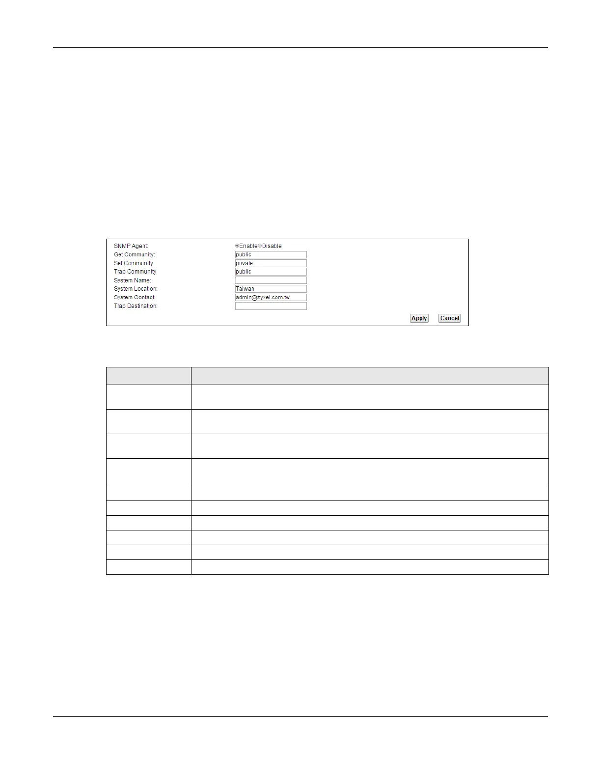 SNMP Agent Select Enable to let the VMG act as an SNMP agent, which allows a manager station to