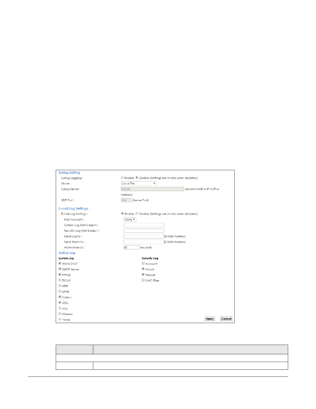 Table 138 Maintenance > Logs Setting