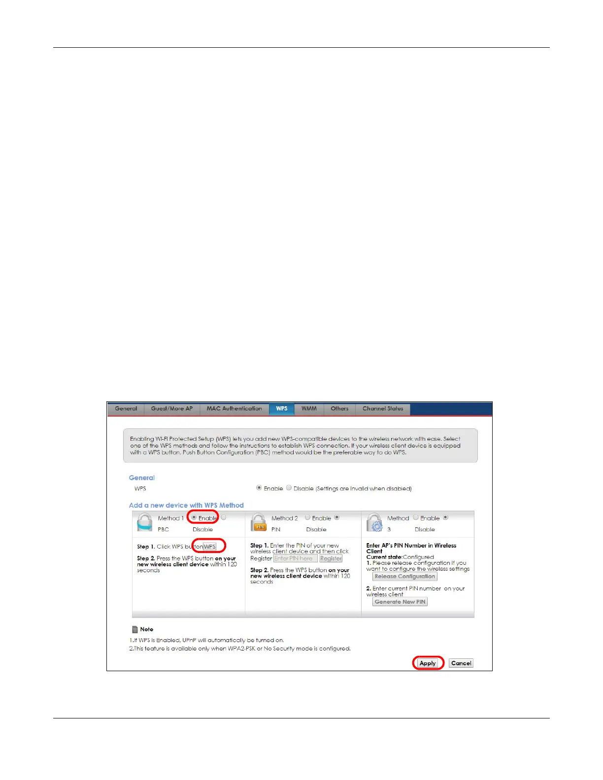 screen. Enable the WPS function for method 1 and click Apply. Then click the Connect button.