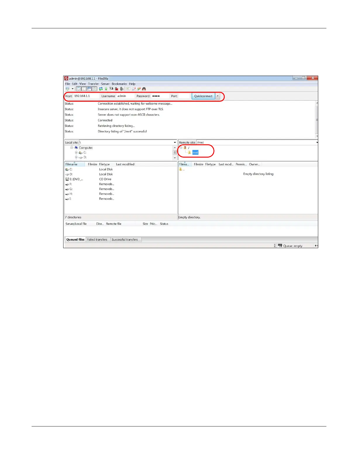 1 In FileZilla enter the IP address of the VMG (the default is 192.168.1.1), your account’s user name and