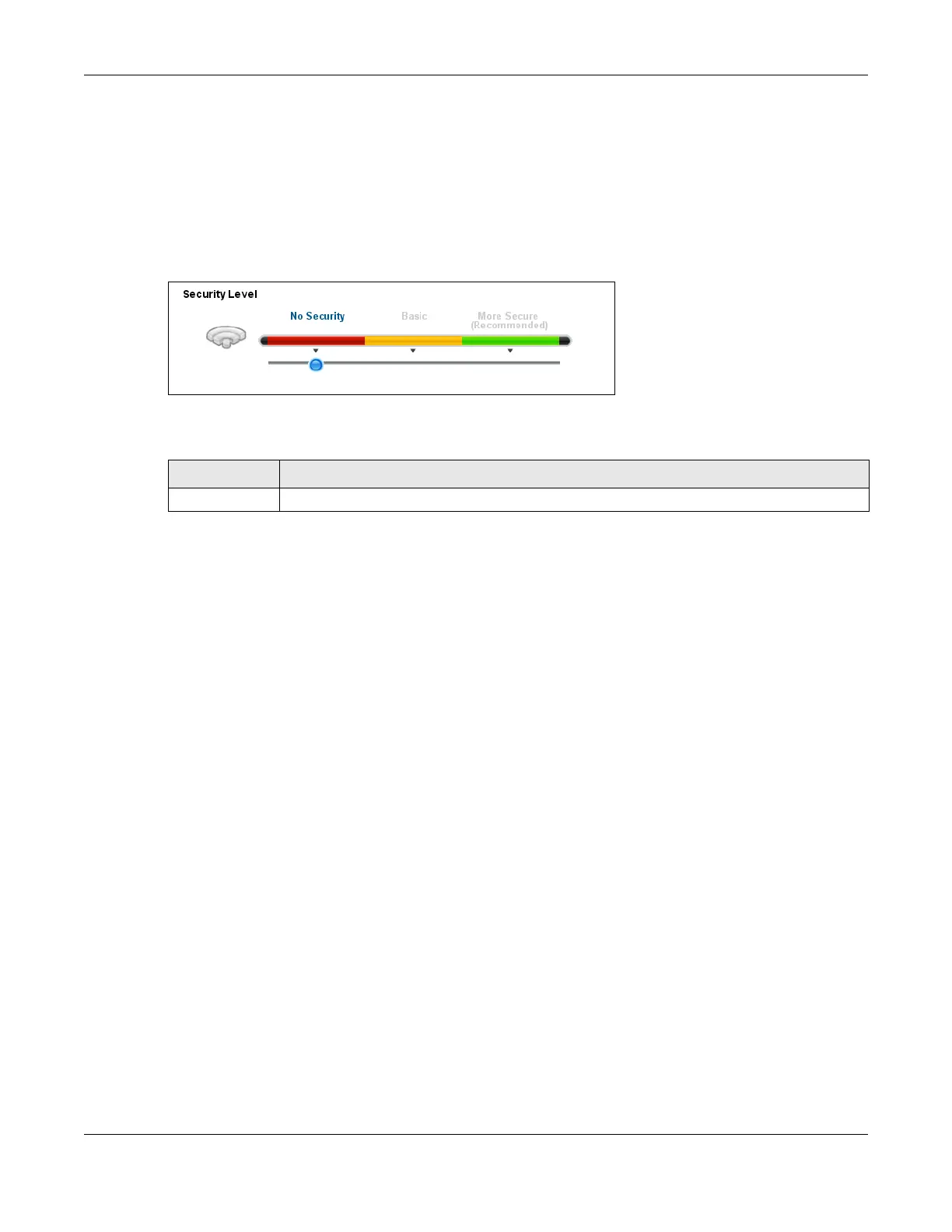 Security Level Choose No Security to allow all wireless connections without data encryption or authentication.