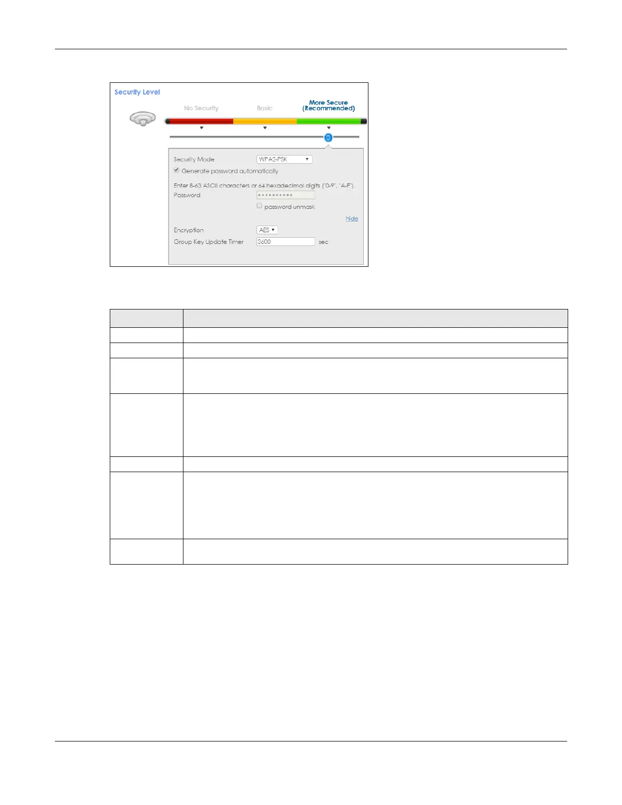 Security Level Select More Secure to enable WPA(2)-PSK data encryption.