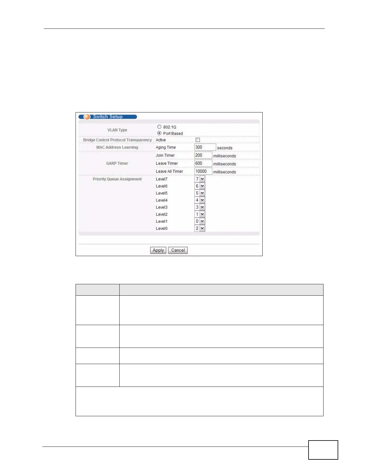 Table 12 Basic Setting > Switch Setup