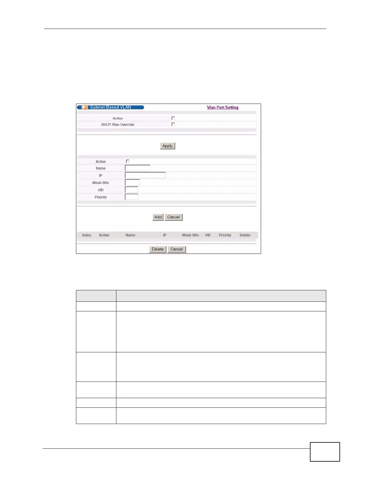 Table 20 Advanced Application > VLAN > VLAN Port Setting > Subnet Based VLAN
