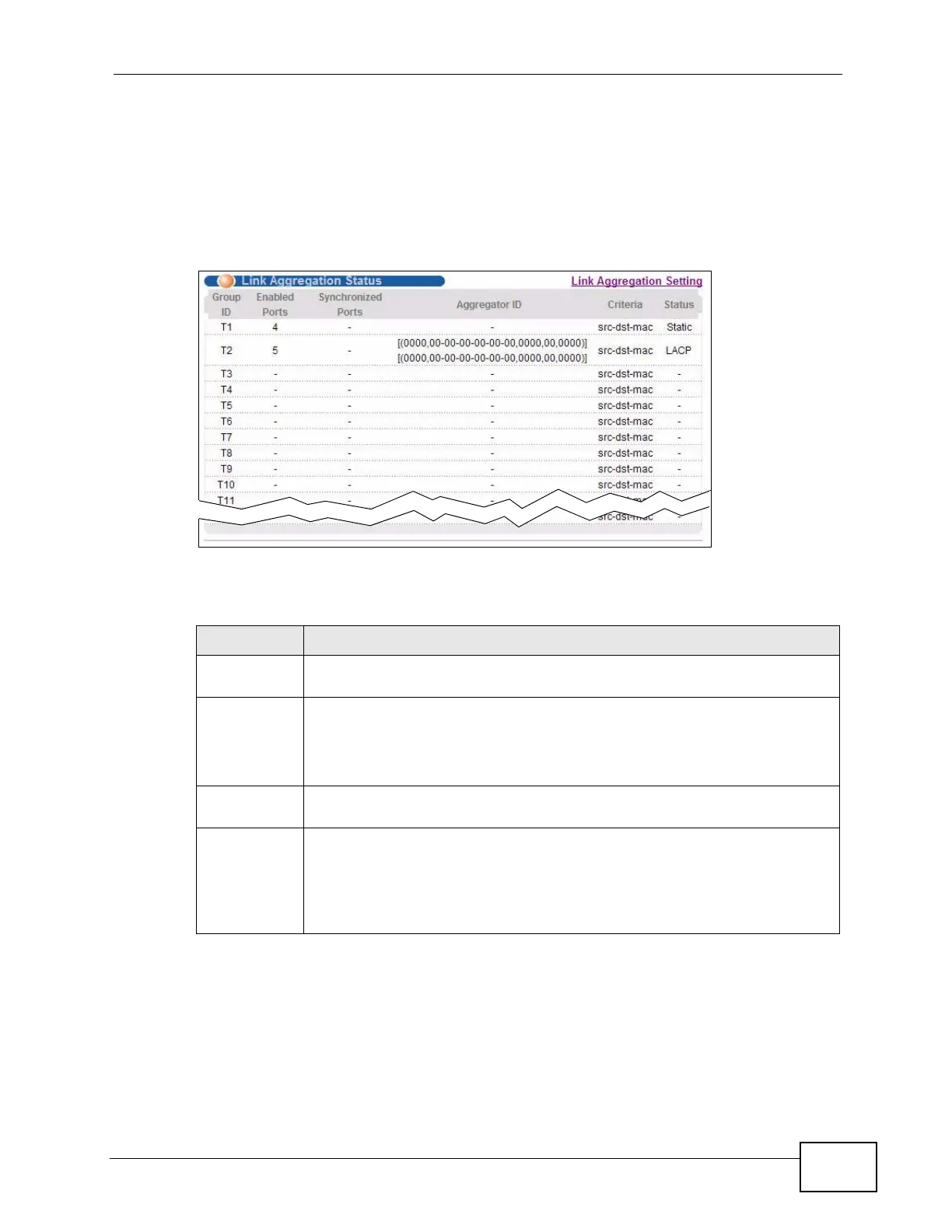 Link Aggregation Status screen displays by default. See Section 17.1 on page