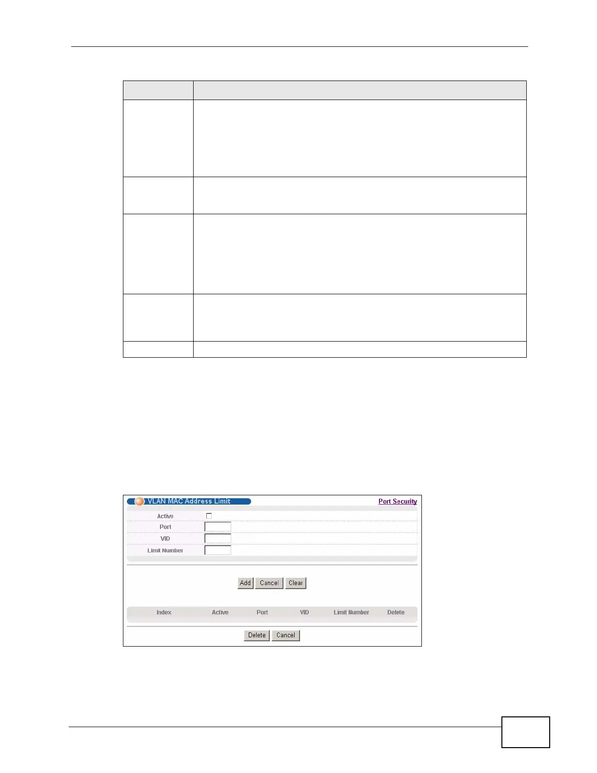 Table 47 Advanced Application > Port Security (continued)