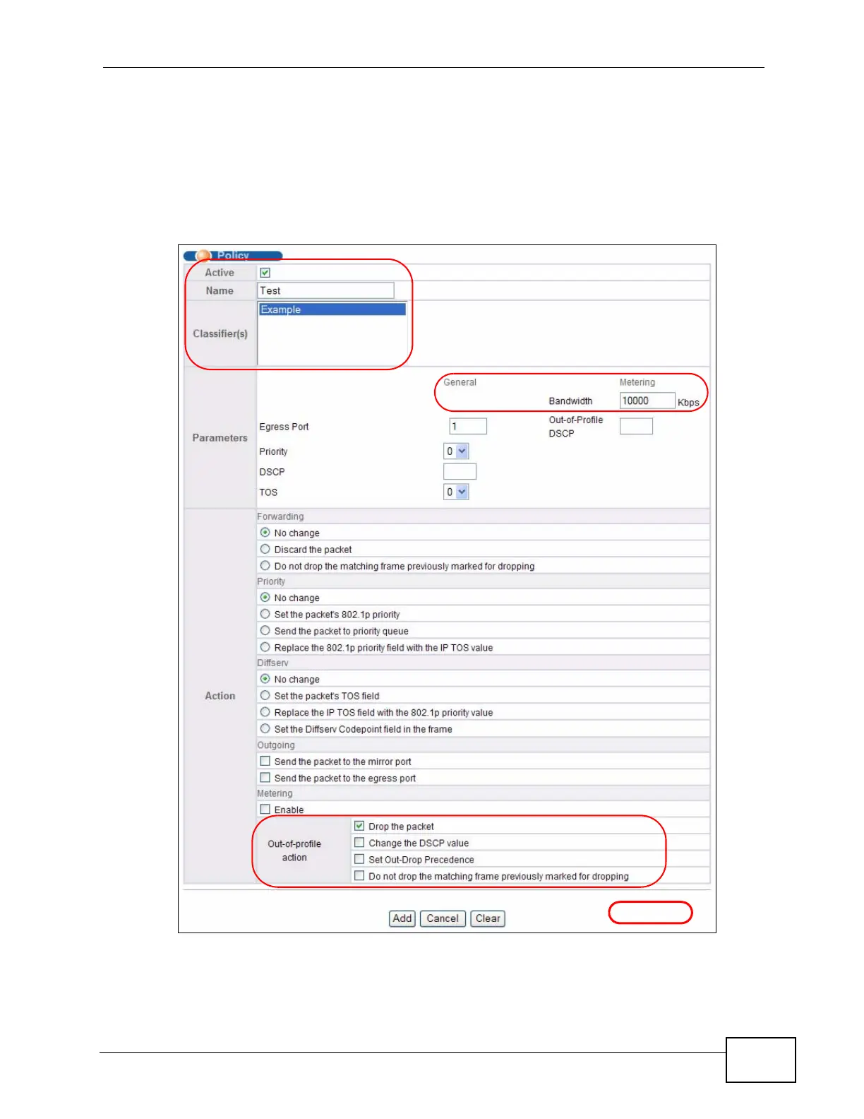 limit bandwidth and discard out-of-profile traffic on a traffic flow classified using