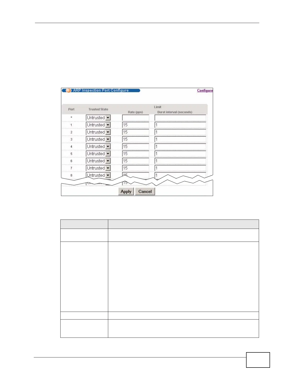 Use this screen to specify whether ports are trusted or untrusted ports for ARP