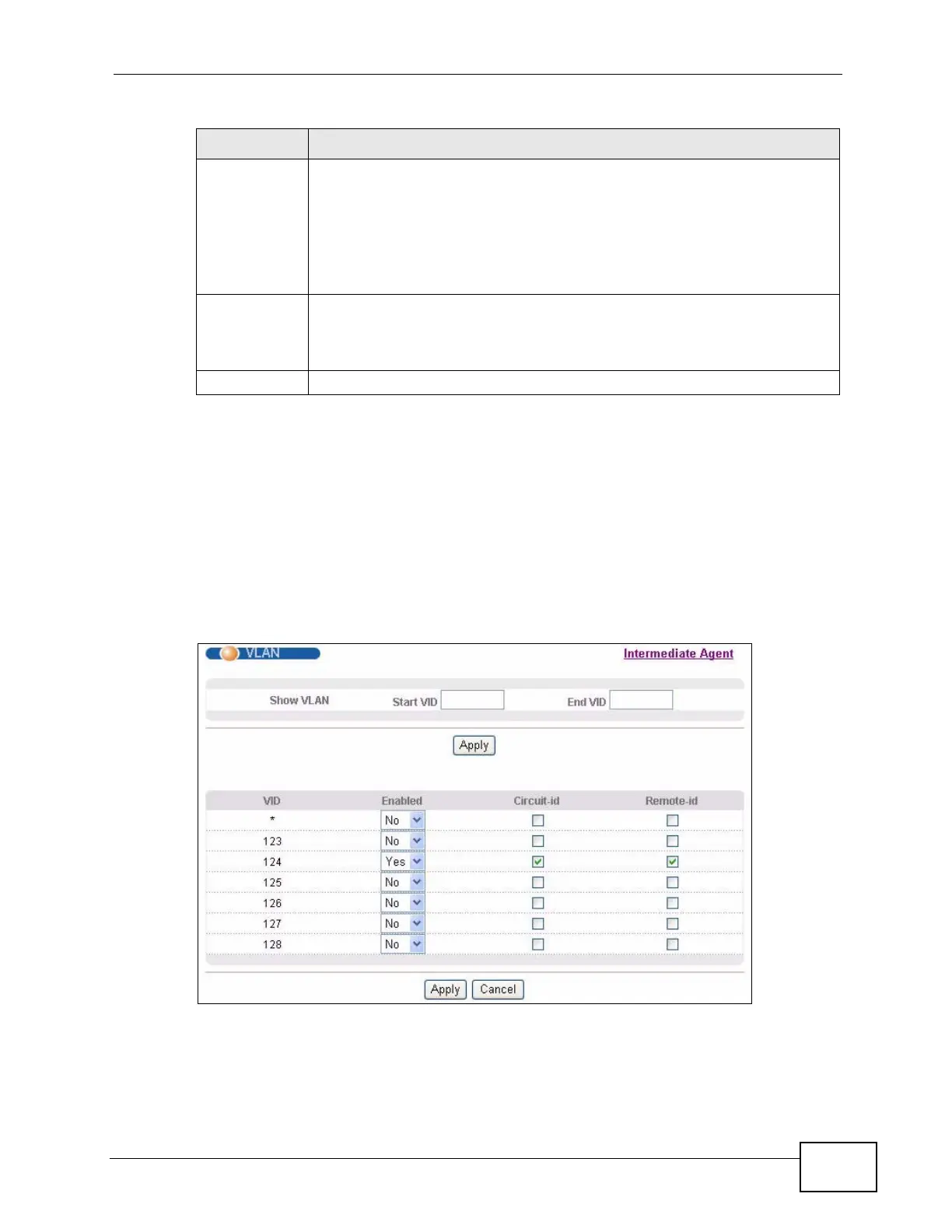 Click the VLAN link in the Intermediate Agent screen to display the screen as