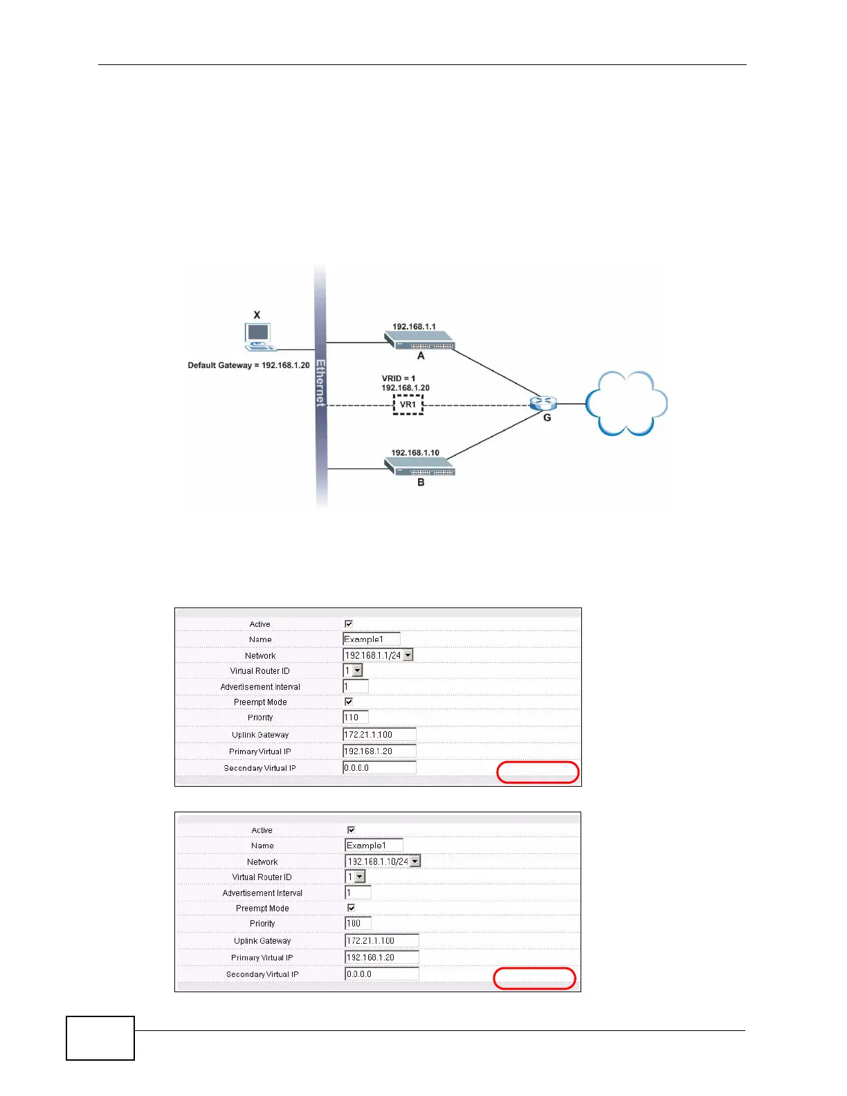 Figure 203 VRRP Example 1: VRRP Parameter Settings on Switch B