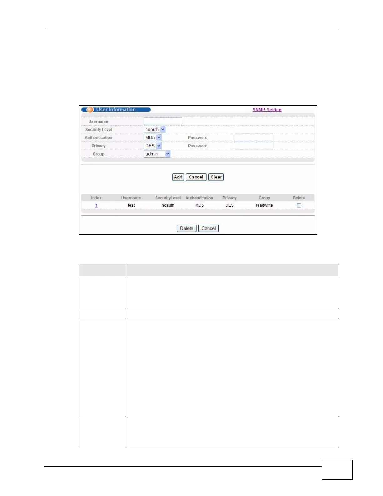 From the SNMP screen, click User to view the screen as shown. Use the User