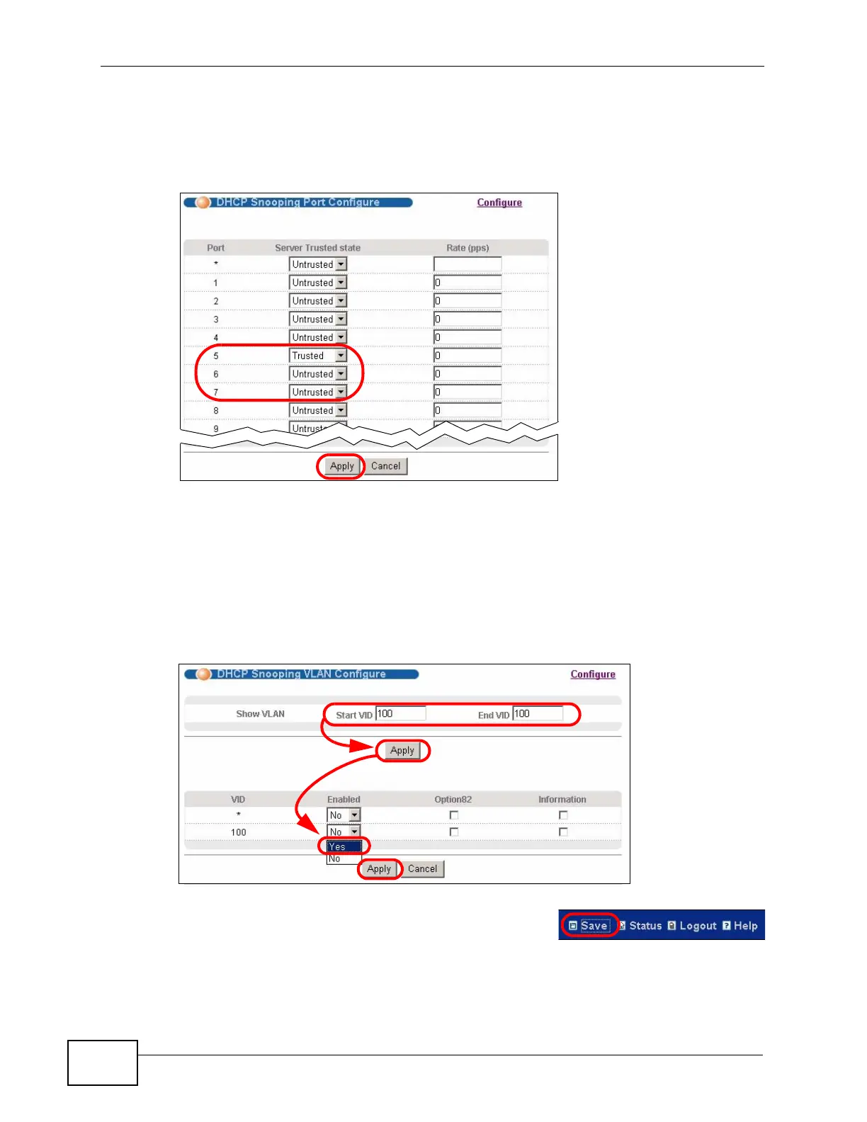 6 The DHCP Snooping Port Configure screen appears. Select Trusted in the