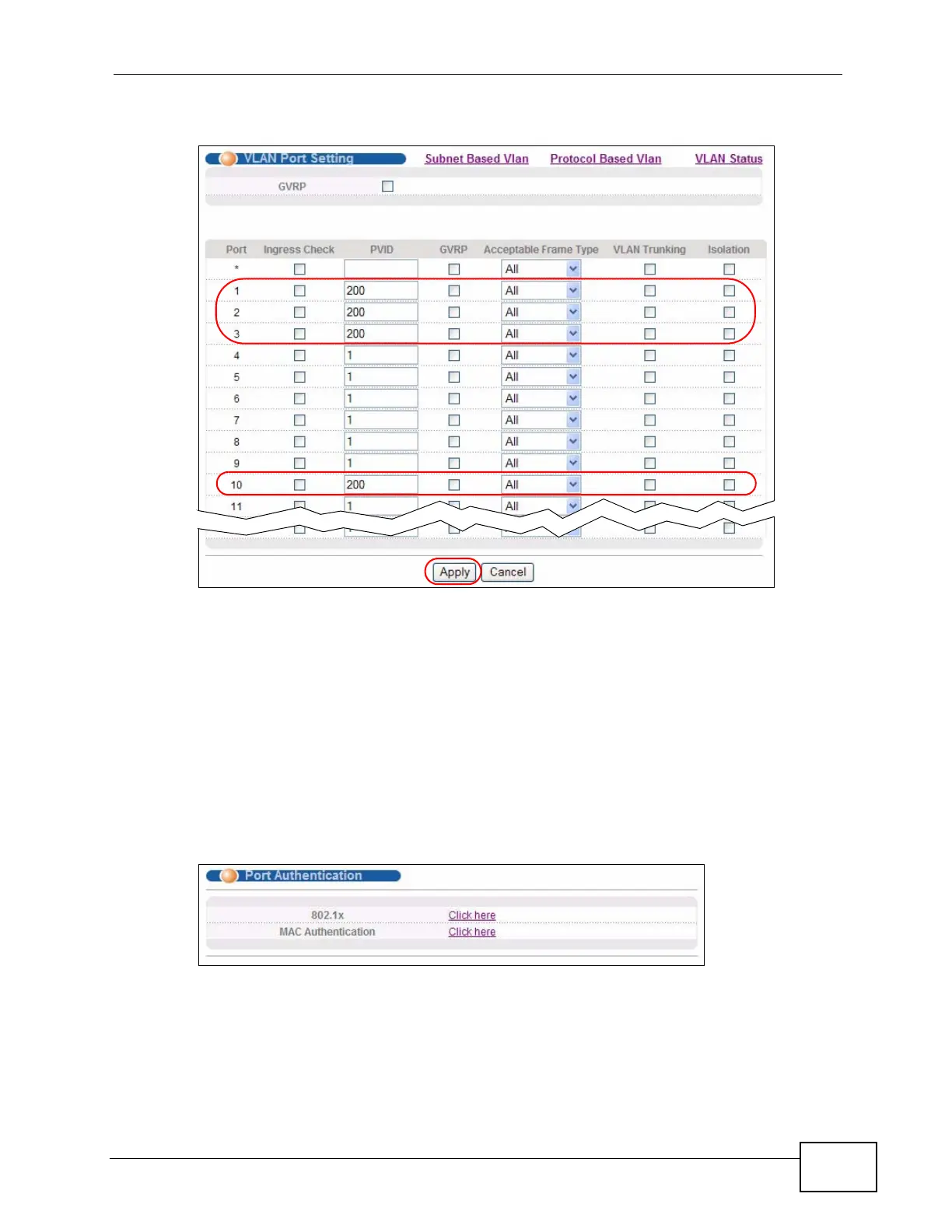 1 Click Advanced Application > Port Authentication and then the Click Here