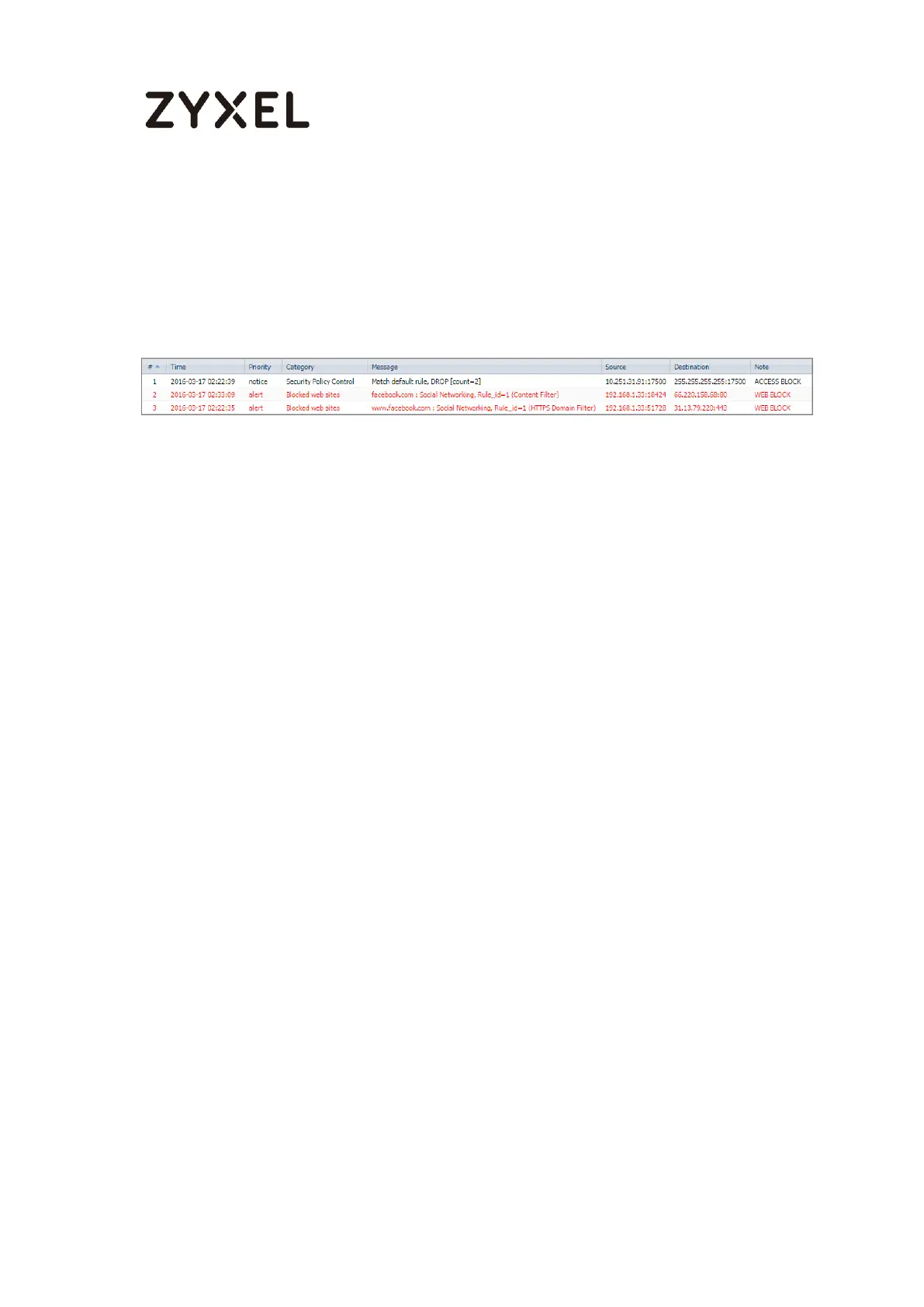 Go to the ZyWALL/USG Monitor > Log, you will see [alert] log message such as below.