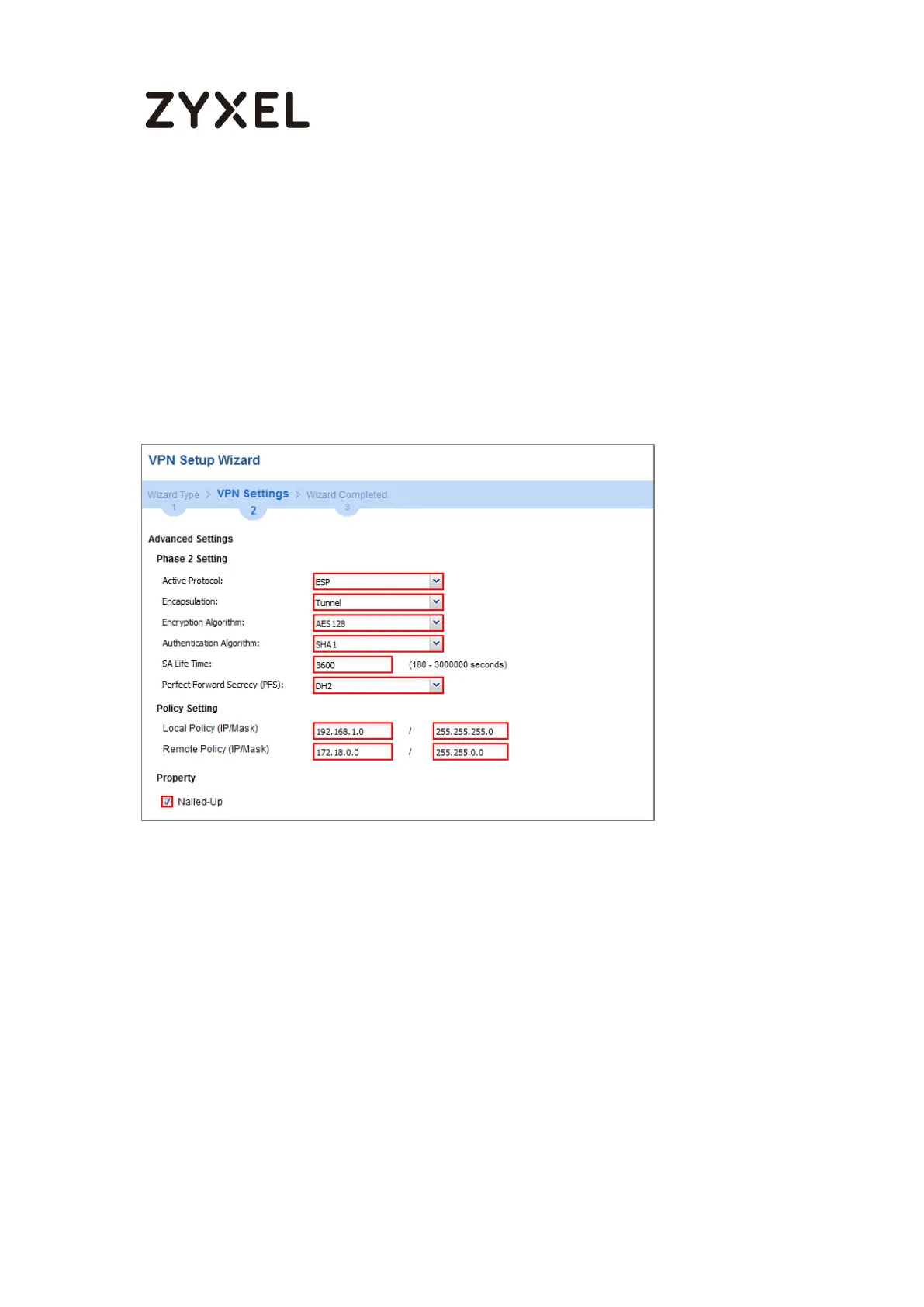 Continue to Phase 2 Settings to select the Encapsulation, Encryption,