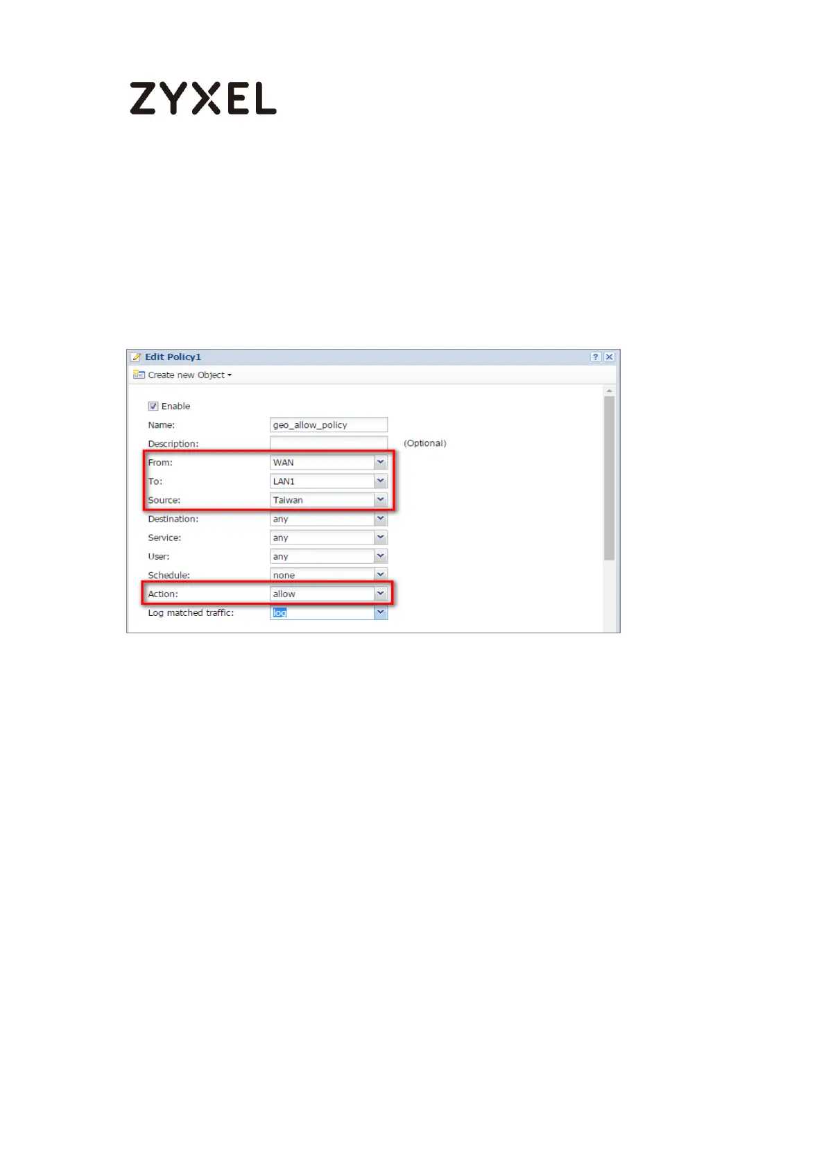 for you to identify the Security Policy profile. Set Geo IP traffic from WAN to LAN allow