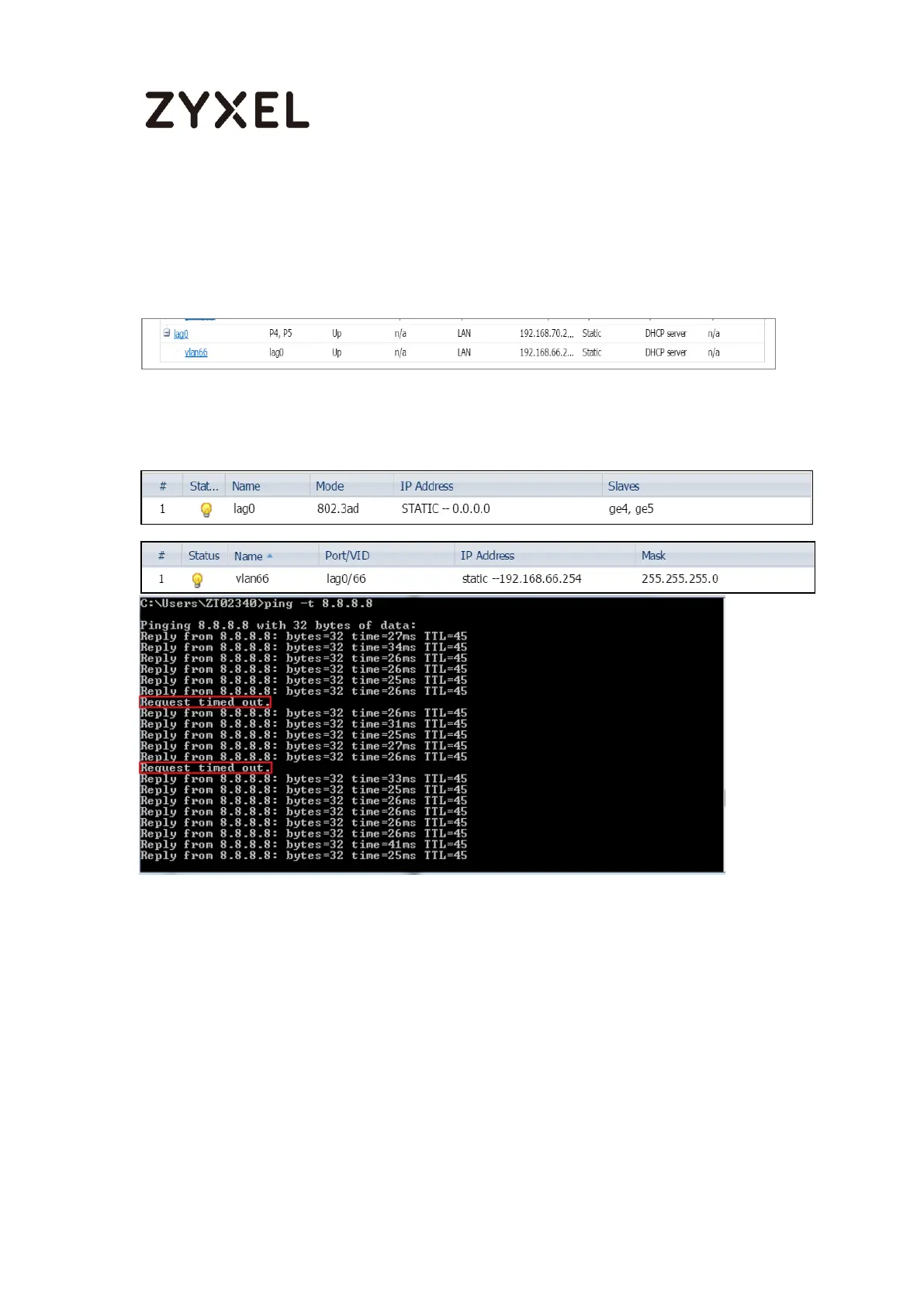 Below we are using 802.3ad LAG interface with Vlan66 for the example, unplug one of