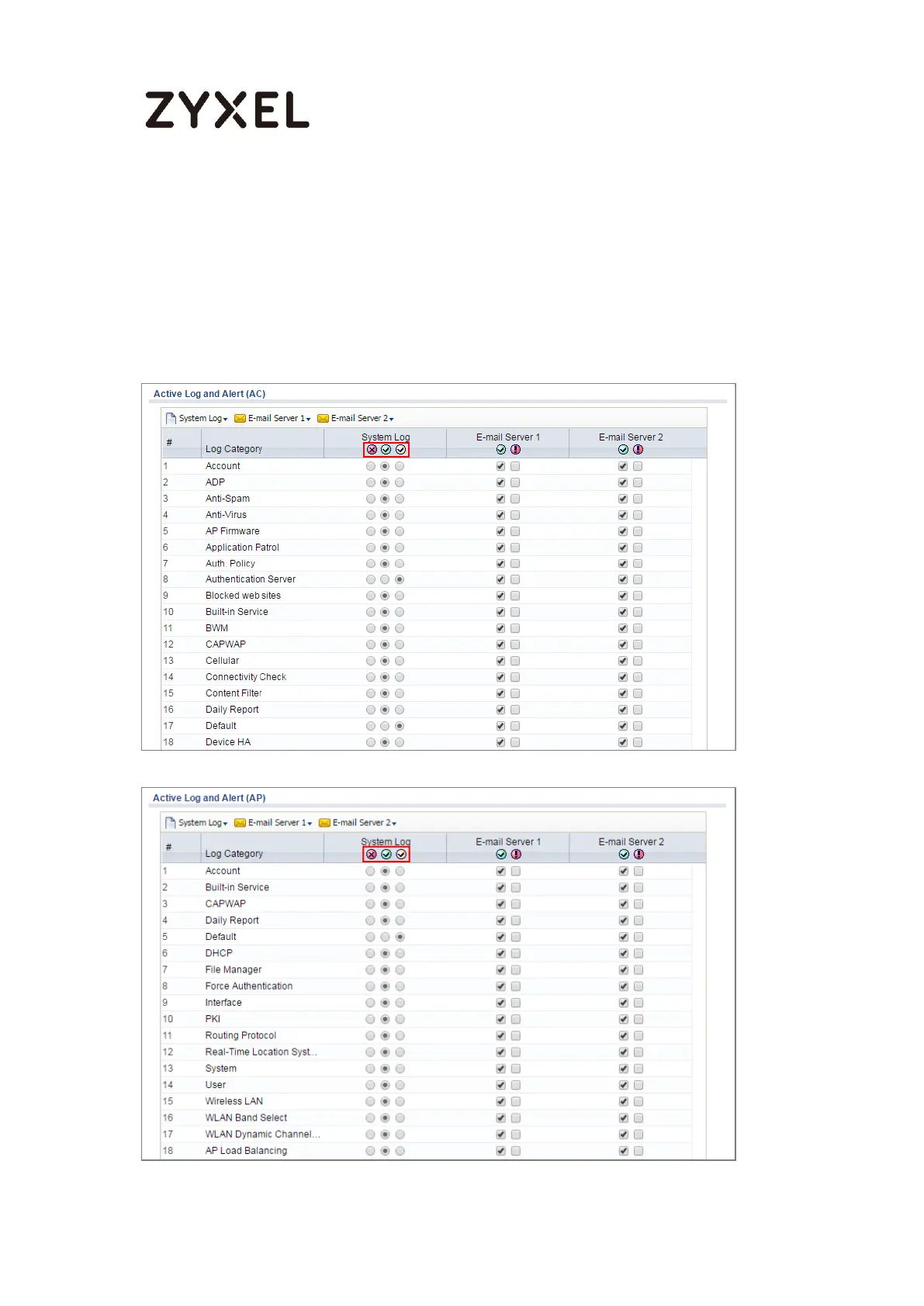 Log and Alert. Use the System Log drop-down list to change the log settings for all