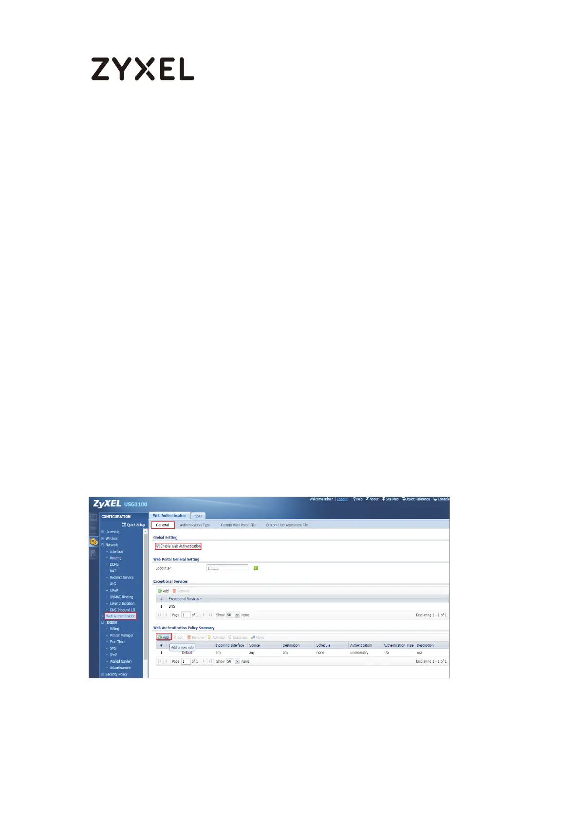 1. On the USG1100, go to Configuration > Web Authentication > General. Select